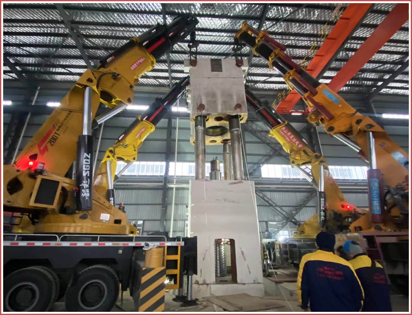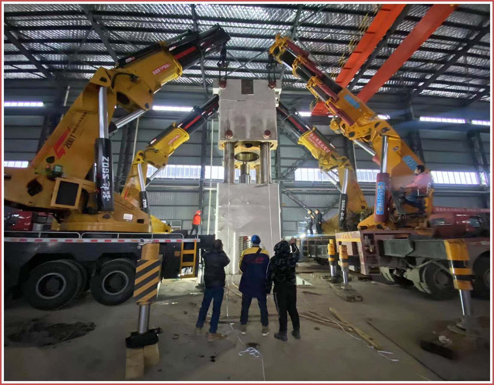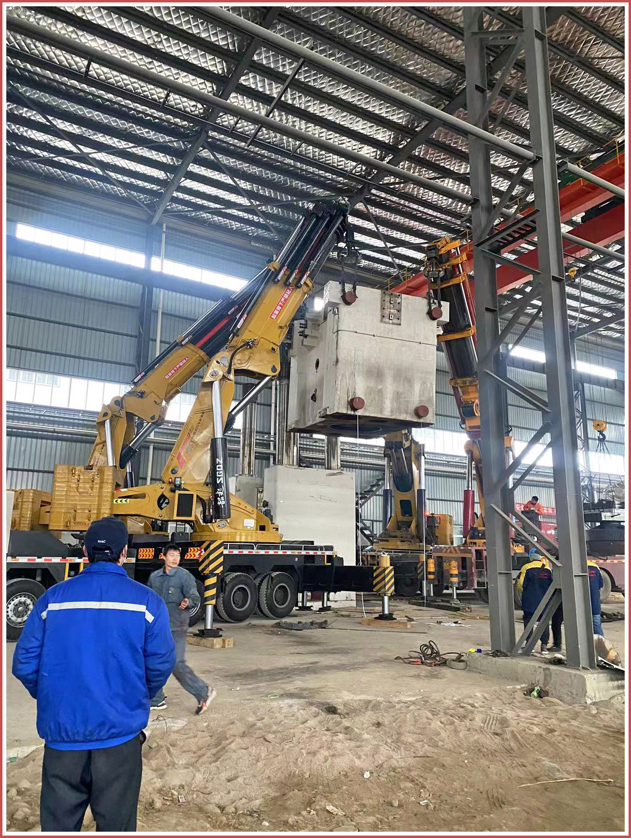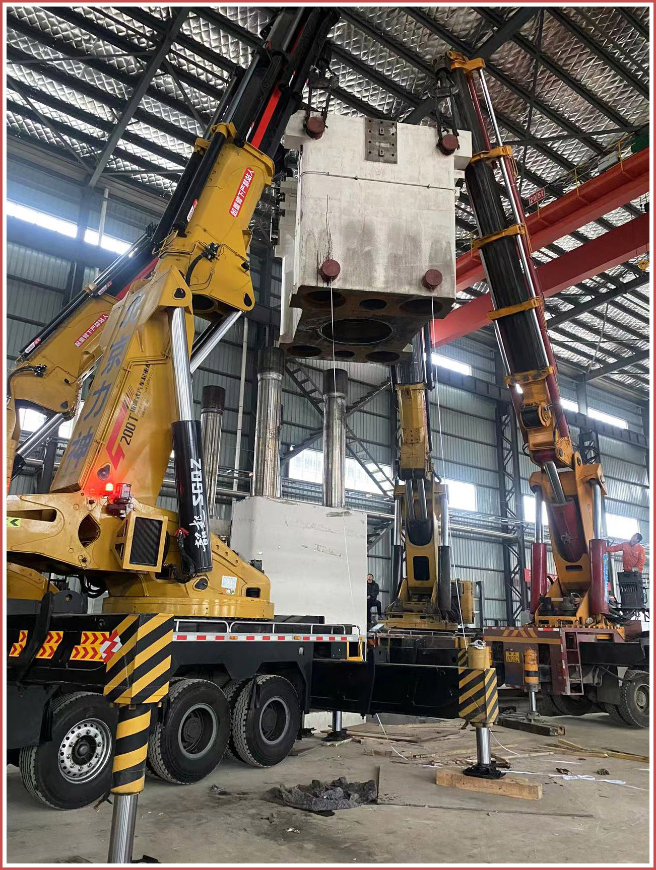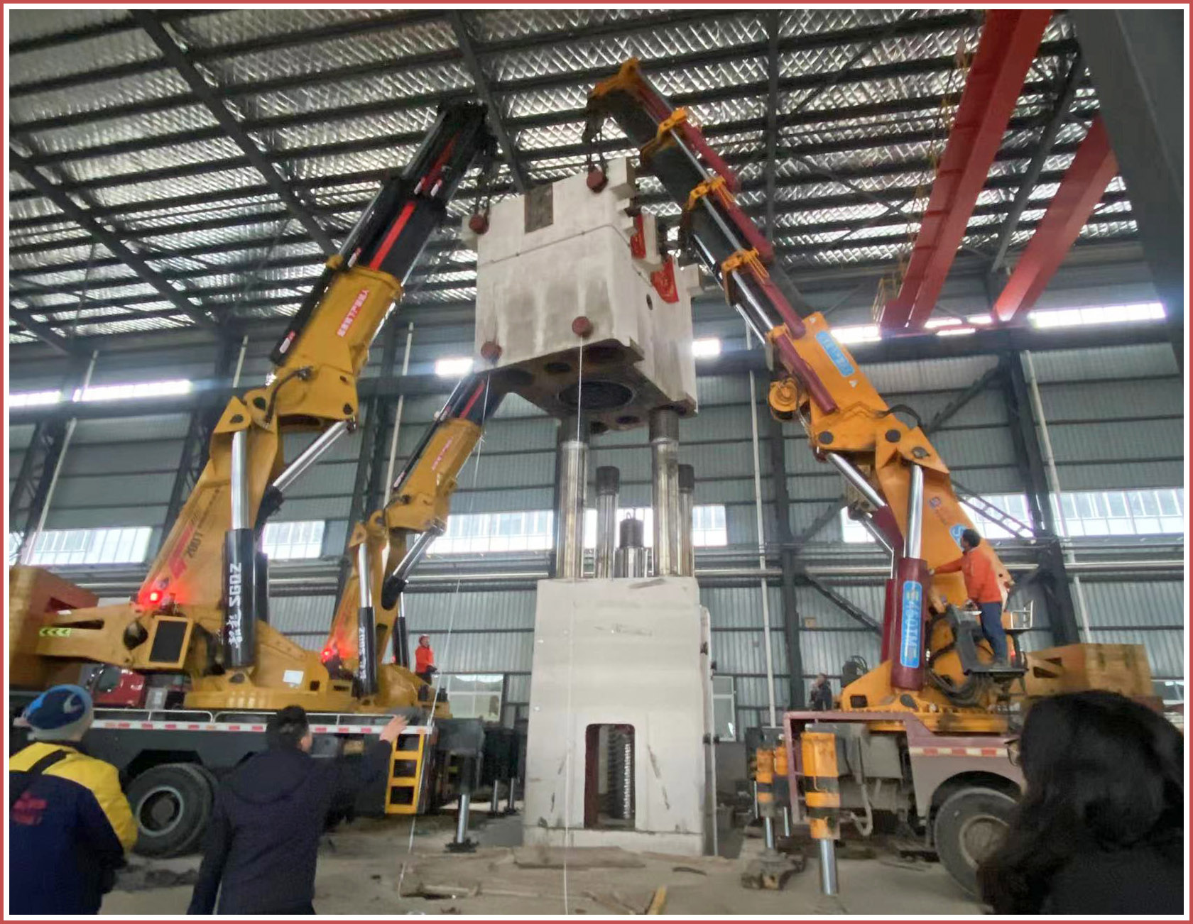 (2)韶起SQ200T三叉戟和韶起SQ4500擺放就位,合力抬起電動(dòng)螺旋壓力機(jī)上蓋