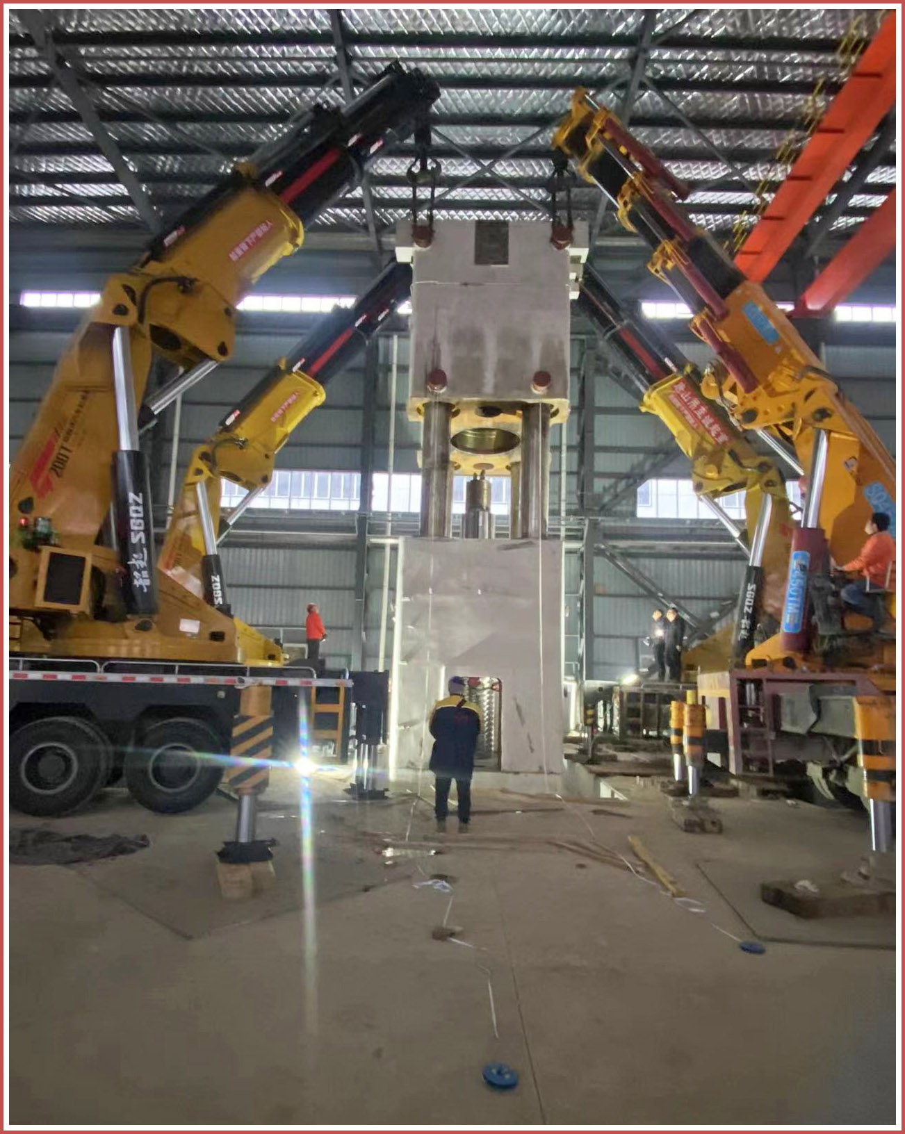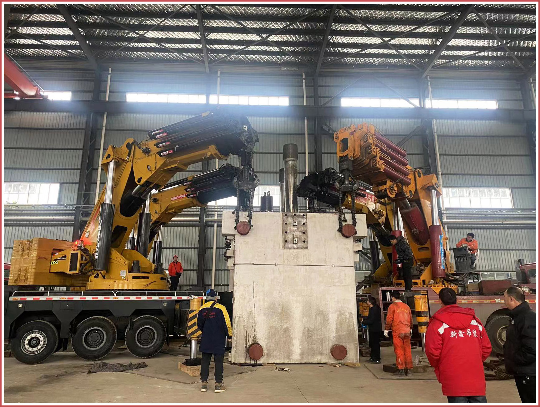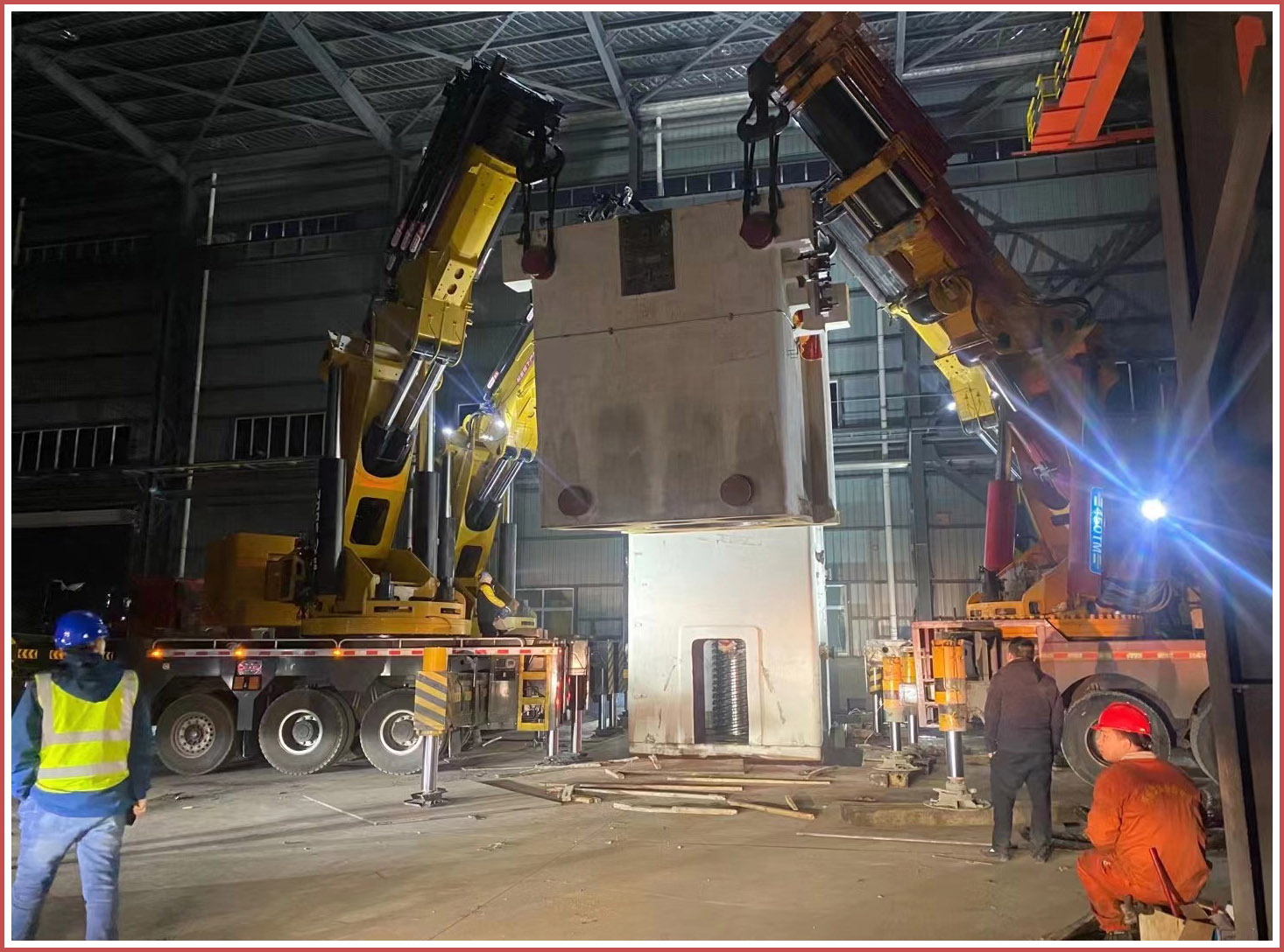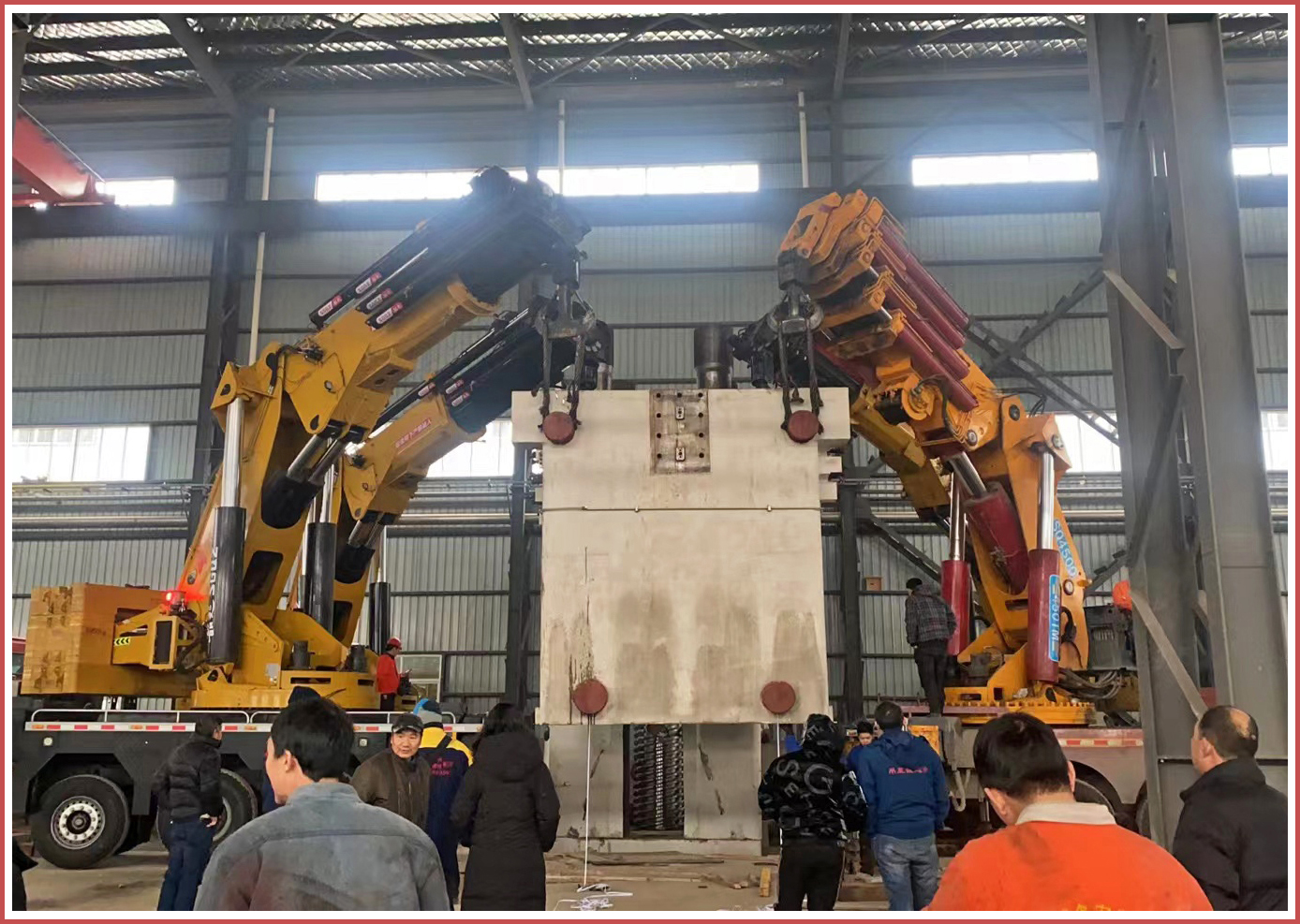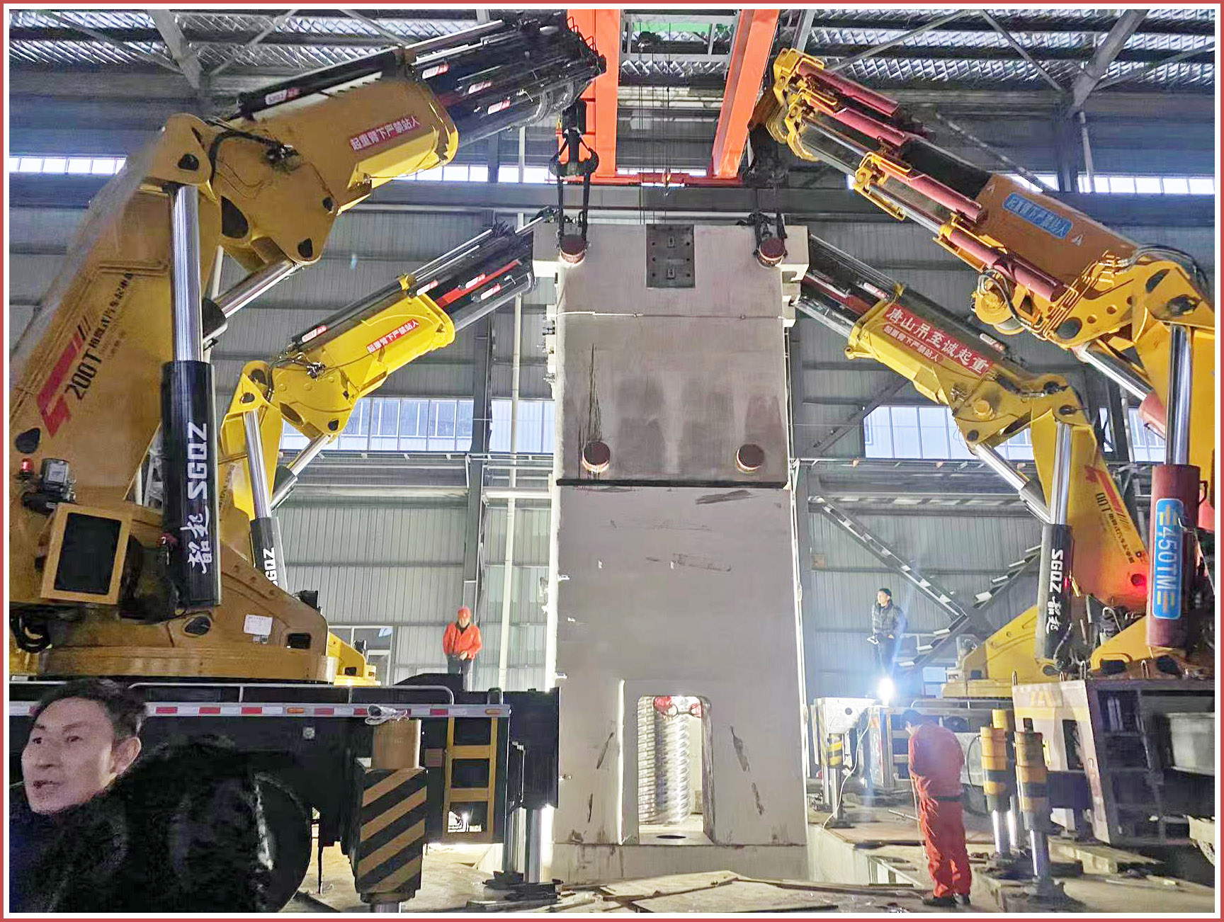 (2)韶起SQ200T三叉戟和韶起SQ4500擺放就位,合力抬起電動(dòng)螺旋壓力機(jī)上蓋